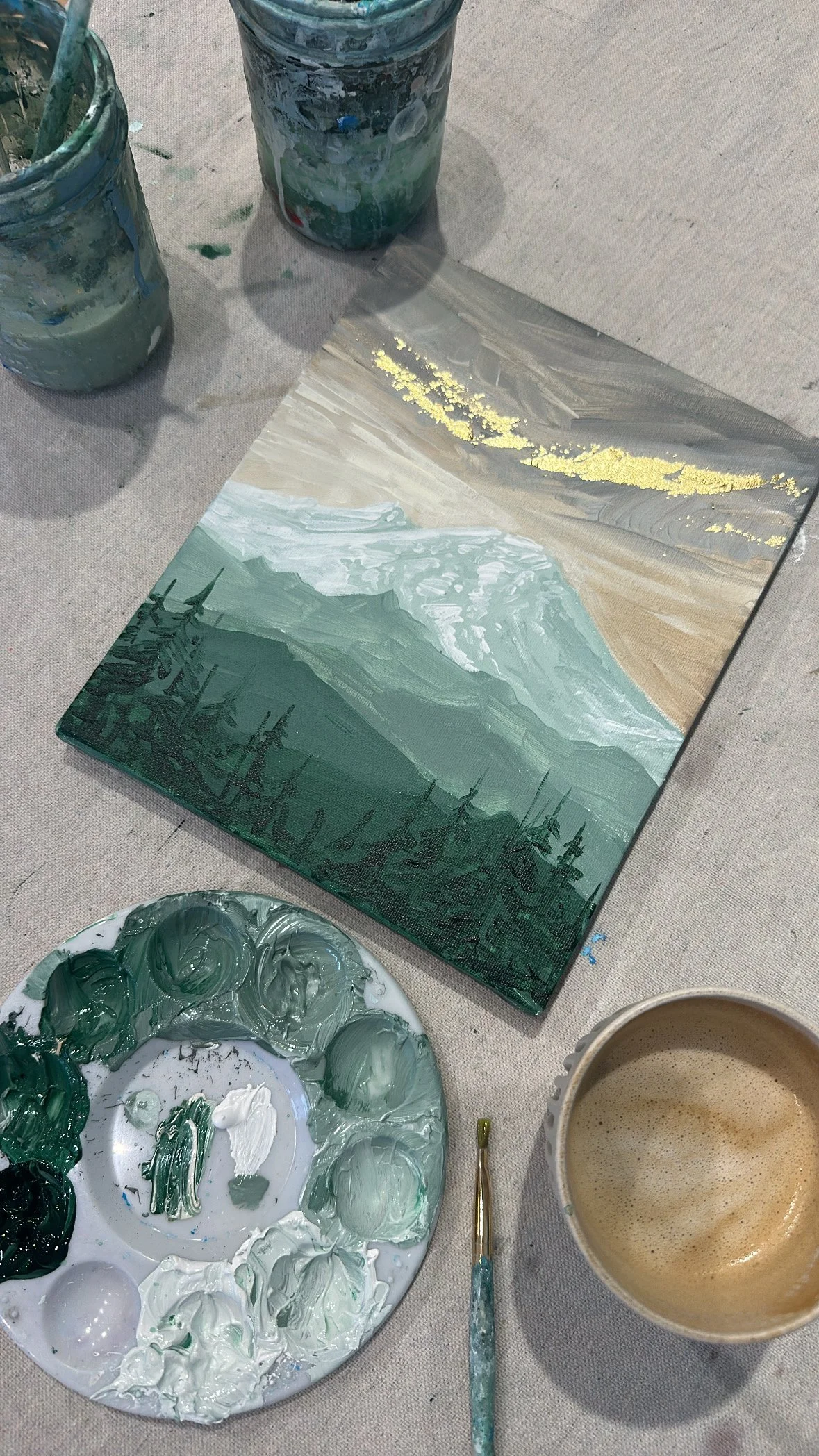 Join PNW fine ARTIST + GALLERY OWNER LAURA BURKHART for aN EVENING of creativity + connection with WINE and CHARCUTERIE from local favorite VIRTUE CELLARS. Laura will guide you through a brand new version of her Painted Peaks Workshop titled "EVERGREEN" where you'll learn to paint the Northwest's Iconic Mt. Rainier on a misty grey morning, with of a little touch of sunlight coming through of course. We'll provide everything you need to paint and learn color mixing, composition, Laura's personal mountain painting technique, and how to add that metallic touch.